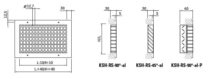 Ramka czołowa oraz wewnętrzny raster osłonowy wykonane z wytłaczanych profili aluminiowych. Osadzenie kierownic na stałe poziome - KSH-RS-90°-al lub pod kątem 45° - KSH-RS-45°-al.