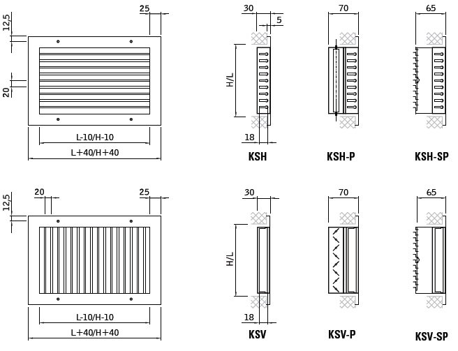 Kratka wentylacyjna stalowa jednorzędowa KSH/KSV do nawiewu lub wywiewu powietrza w instalacjach nisko i średnio ciśnieniowych, w środowisku nieagresywnym o wilgotności względnej do 70%.