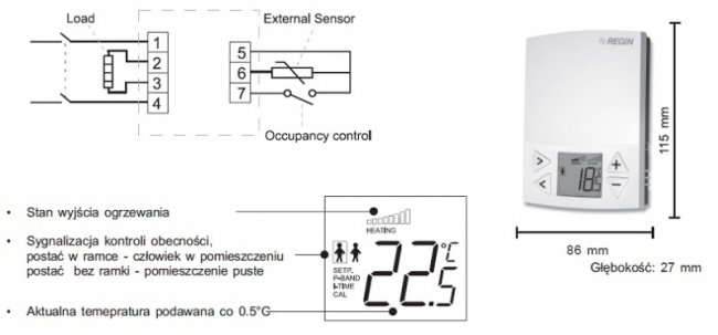 | Wejście czujnika zewn./zewn. urządzenia nastawczego | Przeznaczone dla czujnika NTC 0...30°C. Wybór czujnika lub zewn. urządzenia nastawczego. |