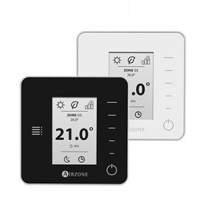 Interfejs graficzny z energooszczędnym ekranem e-ink i przyciskami dotykowymi do sterowania strefami w systemach Airzone. Komunikacja bezprzewodowa. Zasilany baterią CR2450. Wykończone stalą i szkłem.