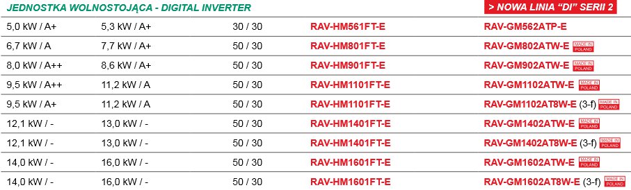 - Duży wybór wydajności: dla trybu chłodzenia od 5,0 kW do 16,0 kW, a dla trybu grzania od 5.6 kW do 18,0 kW,