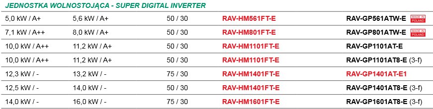 Klimatyzator kolumnowy SUPER DIGITAL INVERTER RAV-RM_1FT-EN z agregatem RAV-GP_AT-E to klimatyzator wolnostojący łącząca wysoką wydajność, duży przepływ powietrza oraz uproszczoną instalację mająca zastosowanie przy chłodzeniu i ogrzewaniu obszerniejszych pomieszczeń.