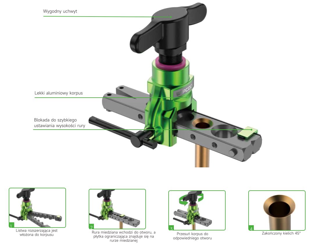 Precyzyjne rozwiercanie: Specjalna konstrukcja kielicharki umożliwia precyzyjne rozwiercanie, zapewniając idealne dopasowanie i uszczelnienie rur.