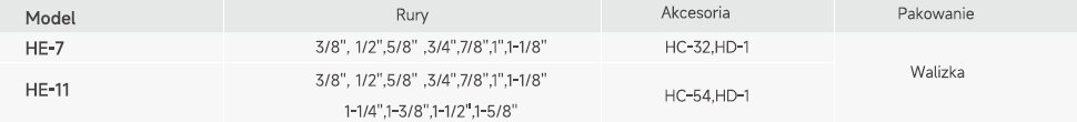 Akcesoria i pakowanie: Model HE-7 jest wyposażony w akcesoria HC-32, HD-1, zapewniając większą elastyczność użytkowania. Całość jest dostarczana w praktycznej walizce, co ułatwia przechowywanie i transport narzędzia.