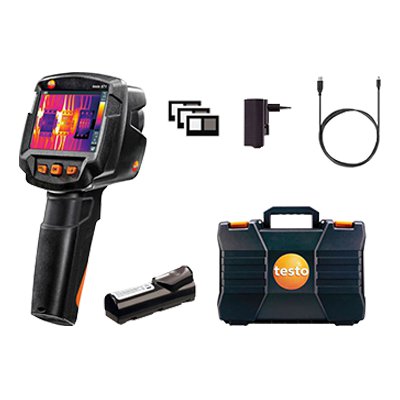 Kamera termowizyjna Testo 871 z modułem bezprzewodowym BT/LAN, kablem USB , zasilaczem sieciowym, akumulatorem litowo-jonowym, profesjonalnym oprogramowaniem, 3 x ε-markerami, instrukcją obsługi, certyfikatem kalibracyjnym oraz walizką.