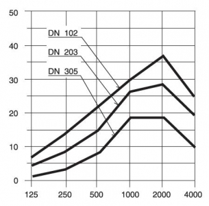 Poziom hałasu dla SNL Grubość izolacji akustycznej 25 mm Długość odcinka przewodu 1000 mm |