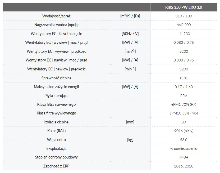 Centrale wentylacyjne RIRS 350 P EKO 3.0 wyposażone są w wydajny obrotowy wymiennik ciepła. Jednostki służą do wentylacji domów oraz innych ogrzewanych pomieszczeń.