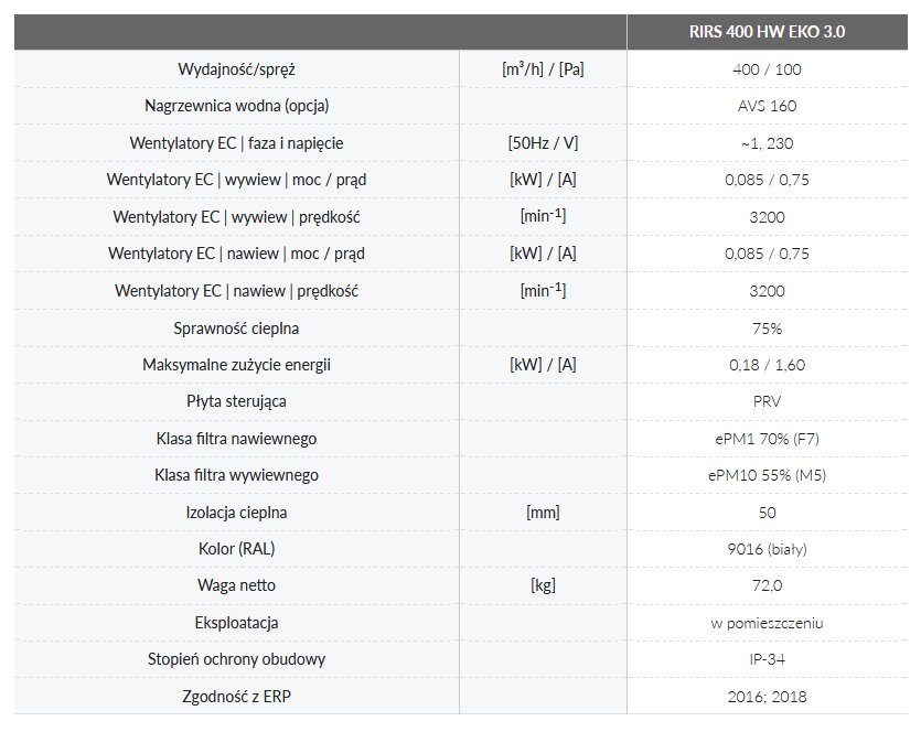 Centrale wentylacyjne RIRS 400 H EKO 3.0 wyposażone są w wydajny obrotowy wymiennik ciepła. Jednostki służą do wentylacji domów oraz innych ogrzewanych pomieszczeń.