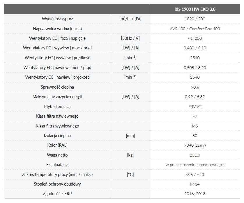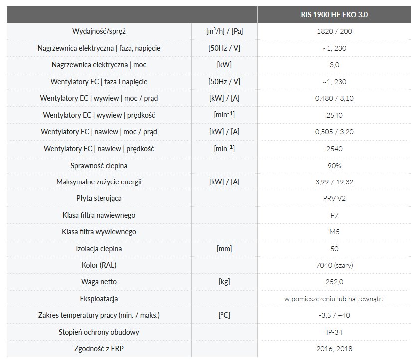 Centrale wentylacyjne RIS 1900 H EKO 3.0 wyposażone są w wysokowydajny przeciwprądowy wymiennik ciepła. Służą do wentylacji domów, biur i innych ogrzewanych pomieszczeń, m.in.: sal lekcyjnych, apartamentów, sal konferencyjnych.