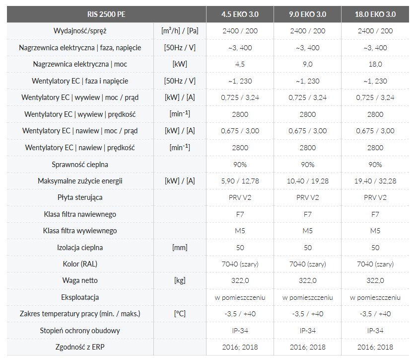 Centrale wentylacyjne RIS 2500 P EKO 3.0 wyposażone są w wysokowydajny przeciwprądowy wymiennik ciepła. Służą do wentylacji domów, biur i innych ogrzewanych pomieszczeń, m.in.: sal lekcyjnych, apartamentów, sal konferencyjnych.