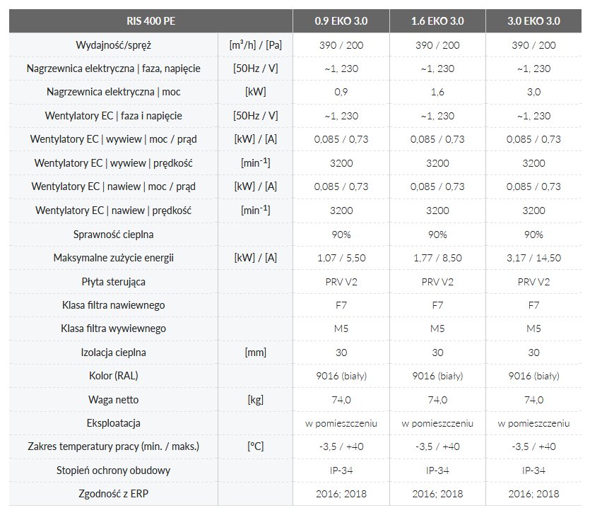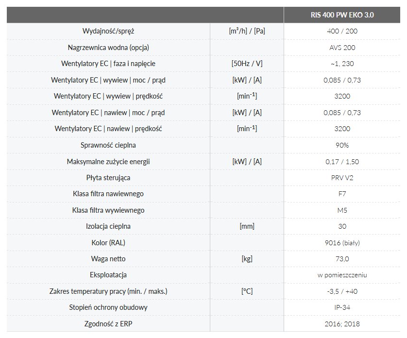 Centrale wentylacyjne RIS 400 P EKO 3.0 wyposażone są w wysokowydajny przeciwprądowy wymiennik ciepła. Służą do wentylacji domów, biur i innych ogrzewanych pomieszczeń, m.in.: sal lekcyjnych, apartamentów, sal konferencyjnych.