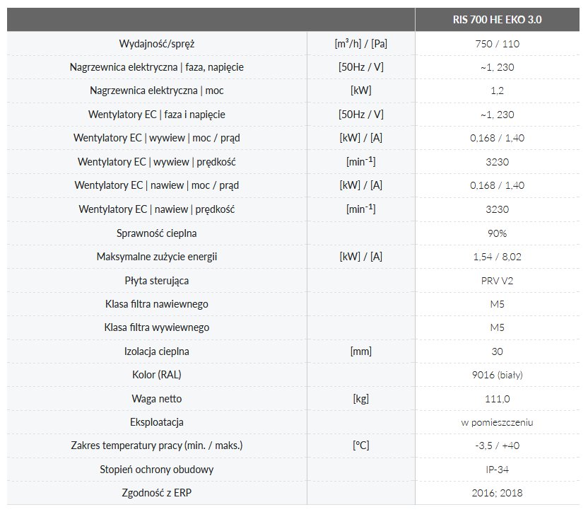 Centrale wentylacyjne RIS 700 H EKO 3.0 wyposażone są w wysokowydajny przeciwprądowy wymiennik ciepła. Służą do wentylacji domów, biur i innych ogrzewanych pomieszczeń, m.in.: sal lekcyjnych, apartamentów, sal konferencyjnych.