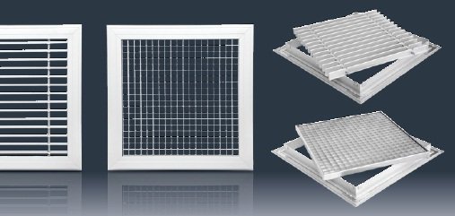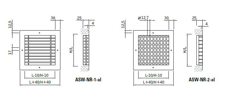- Ramka czołowa oraz wewnętrzny, demontowalny ruszt, wykonane z wytłaczanych profili aluminiowych. Opcjonalne warianty wykonania: demontowalny ruszt o równoległym układzie kierownic ASW-NR-1-al lub demontowalny ruszt o krzyżowym układzie kierownic ASW-NR-2-al.