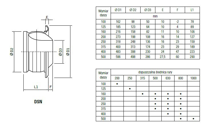 Dysza dalekiego zasięgu DSN (nastawna) do nawiewu w instalacjach nisko i średnio ciśnieniowych, w środowisku nieagresywnym o wilgotności względnej do 70%. Przeznaczona do wentylacji obiektów kubaturowych. Zasięg roboczy do 30 m.