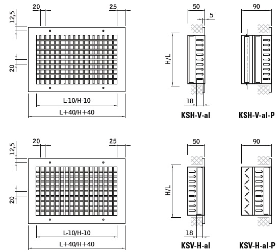 KSH-V-al, KSV-H-al - Kratka wentylacyjna aluminiowa dwurzędowa.