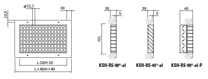 Ramka czołowa oraz wewnętrzny raster osłonowy wykonane z wytłaczanych profili aluminiowych. Osadzenie kierownic na stałe poziome - KSH-RS-90°-al lub pod kątem 45° - KSH-RS-45°-al.