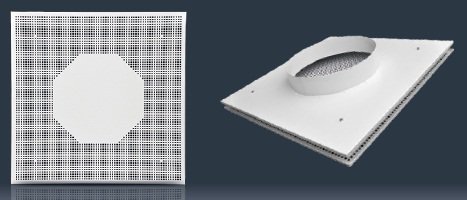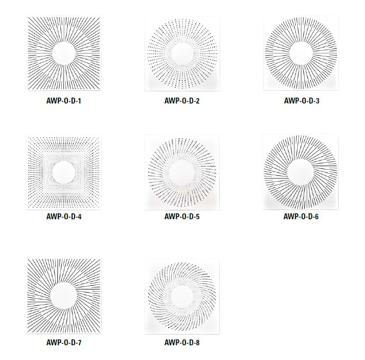 Nawiewnik perforowany AWP-O 595x595 do nawiewu lub wywiewu w instalacjach nisko i średniociśnieniowych, szczególnie w funkcji grzania lub chłodzenia pomieszczeń o wysokości do 4 m, w przypadku dużego zróżnicowania temperatur powietrza nawiewanego i wewnętrznego.