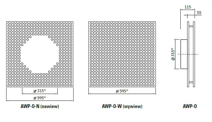 - panel czołowy wykonany z blachy perforowanej stalowej o powierzchni efektywnej: 28% - AWP-O-1 (perforacja ø 6) lub 40% - AWP-2 (perforacja ø 5)