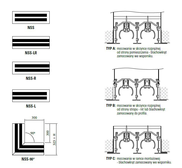 - możliwość łączenia modułów w ciągach o dowolnej długości z wykorzystaniem elementów NSS-R, NSS-L, NSS-LR lub pod kątem 90o za pomocą łącznika kątowego NSS-90o.