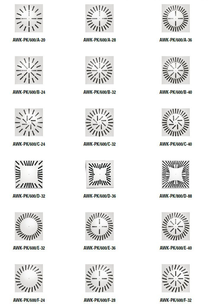 - promieniowo rozmieszczone szczeliny (standardowe ilości: 8, 16, 20, 24, 28, 44, 48, 60, 84 lub 108) zapewniają równomierne rozprowadzenie strumienia. Możliwość ustawienia różnych kierunków wypływu w zależności od odpowiedniego położenia kierownic z tworzywa sztucznego. Standardowy kolor kierownic - czarny. Panel z kierownicami białymi lub bez kierownic na zamówienie.