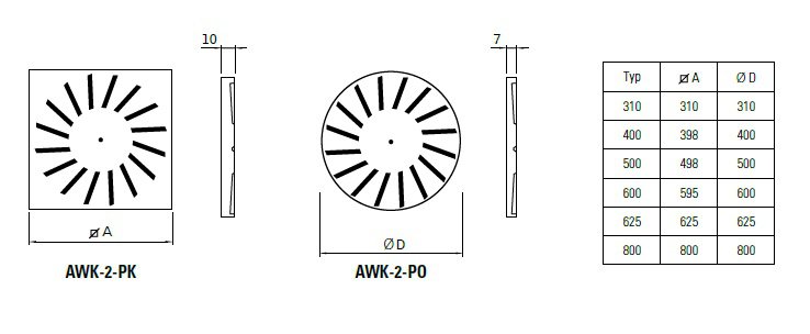 Nawiewnik wirowy kierunkowy AWK 2 do nawiewu w instalacjach nisko i średnio-ciśnieniowych, w środowisku nieagresywnym o wilgotności względnej do 70%.