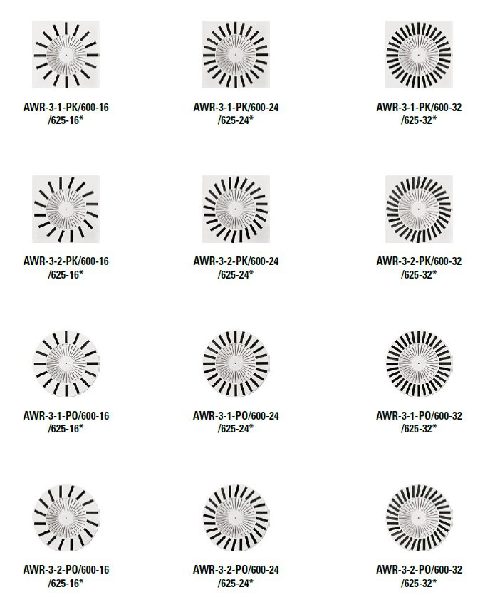 - panel stalowy z wytłoczonymi stałymi kierownicami o średnicy nawiewu Ø 350 w panelu kwadratowym AWR-3-PK lub kołowym AWR-3-PO oraz z promieniowo rozmieszczonymi szczelinami (standardowe ilości 16, 24 i 32) o regulowanym położeniu (zalecane ustawienie pod kątem 45°).