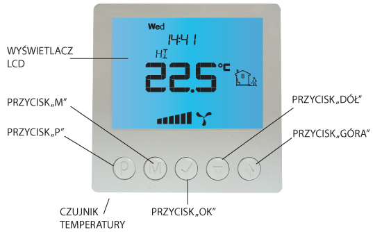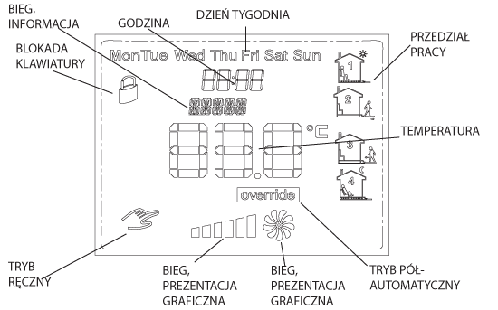 - Duży, podświetlany, ciekłokrystaliczny wyświetlacz LCD, wyświetlający aktualną prędkość wentylatora, temperaturę, nastawy, dzień tygodnia i inne informacje.