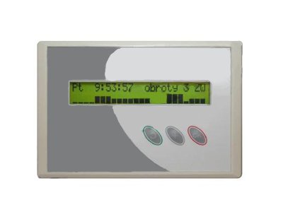 Sterownik jest zbudowany z dwóch modułów. Moduł sterujący (na zdjęciu), oraz moduł wykonawczy umieszczony na urządzeniu. Moduł sterujący może być montowany w dowolnym miejscu (np. na ścianie). Jest połączony z rekuperatorem popularnym kablem RJ45 z wtykiem (długość max 15m). Na wyświetlaczu sterownika oprócz aktualnej godziny wyświetlane są aktualne obroty i wykres nastawionych obrotów w danym dniu. Po zaniku napięcia program przechowywany jest w pamięci.