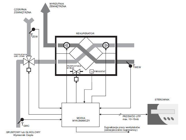 - sterownik jest przystosowany do sterowania przepustnicą GWC. W tej konfiguracji sterownik steruje przepustnicą doprowadzającą powietrze do rekuperatora z dwóch źródeł : z wymiennika gruntowego lub z czerpni powietrza zewnętrznego. W zależności od ustawienia opcji OGRZEWANIE / CHŁODZENIE, sterownik mierząc obydwie temperatury wybiera wyższą (opcja OGRZEWANIE) lub niższą (opcja CHŁODZENIE).